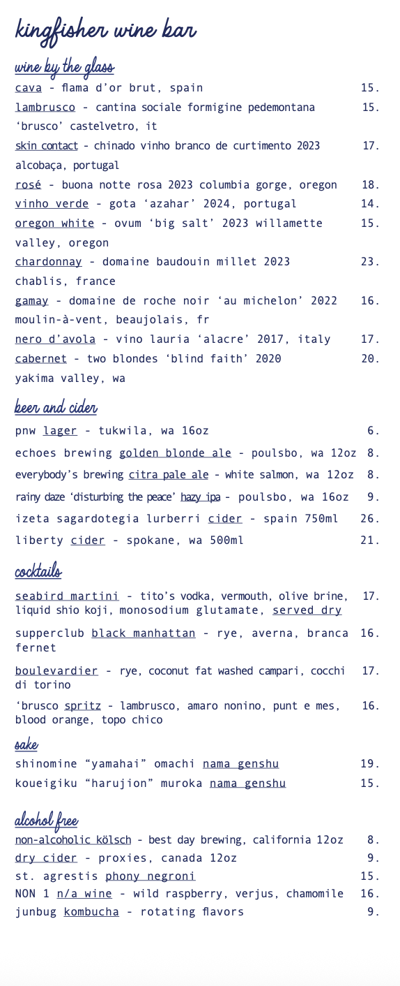 Inspired by the bounty of the farms across the Kitsap and Olympic Peninsulas, our menu starts with the finest seafood, vegetables, poultry and meats from our farmer/fisher/forager friends, and are treated with respect: kissed by our wood-fired oven, seasoned intentionally, or served raw & pristine.