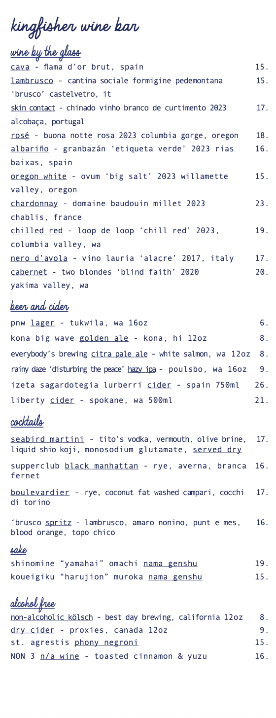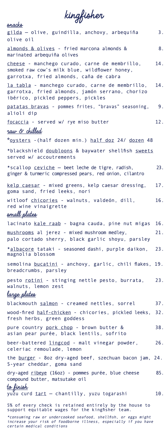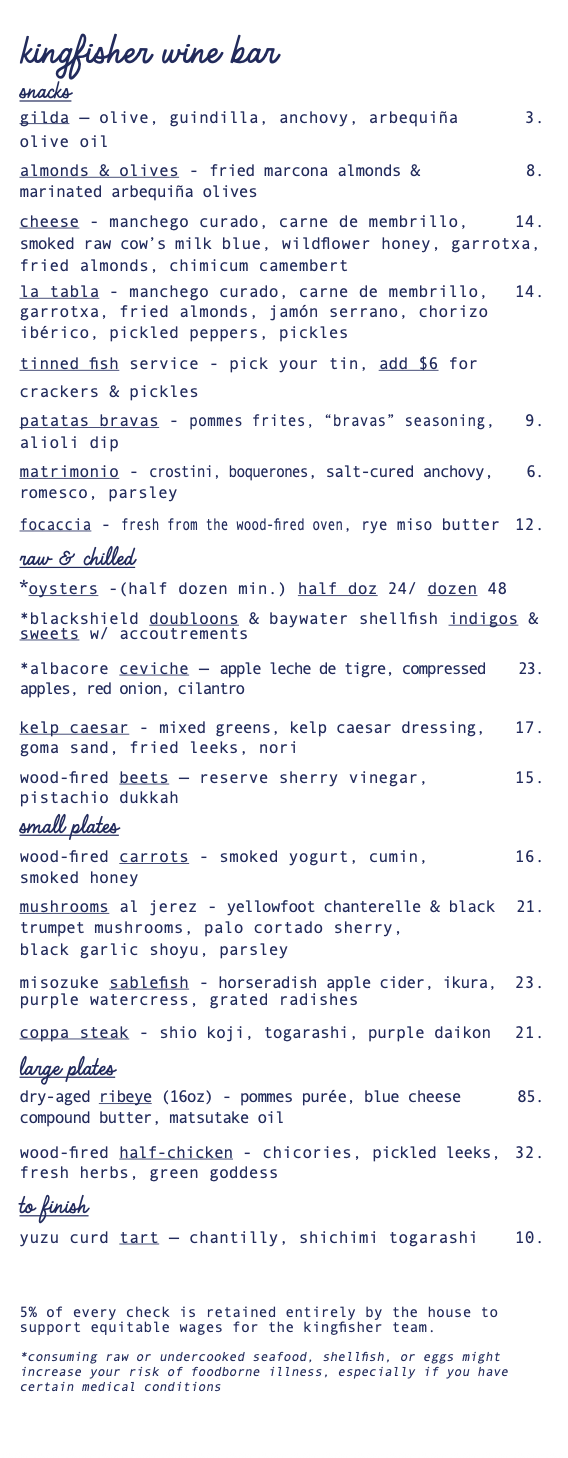 We’re cooking from our wood-fired oven and raw bar, spinning records, pouring glasses, and generally having a great time. No reservations; come as you are and let us whisk you away