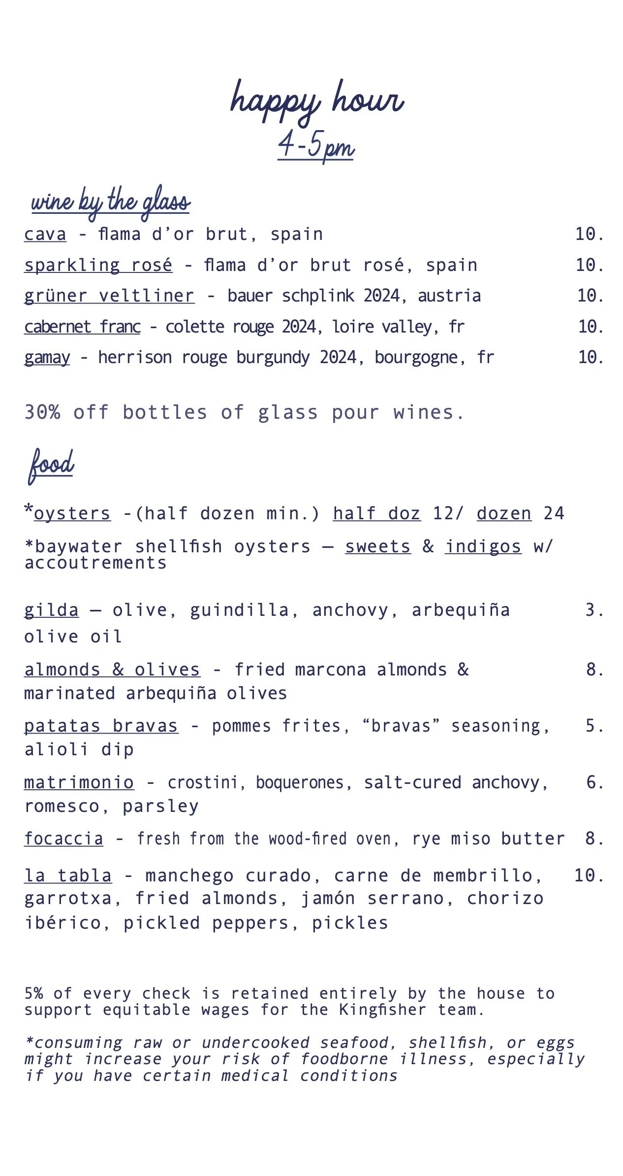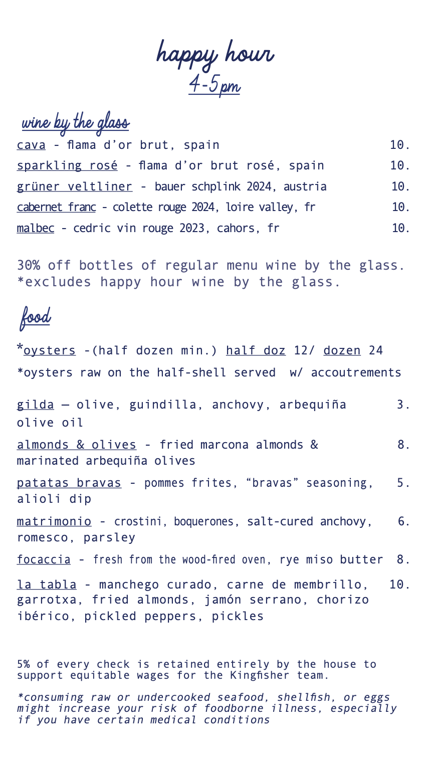 Wednesday-Saturday, seating from 4:00 to 8:00 pm. Happy Hour is 4-5pm Wednesday-Saturday.