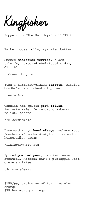 Each dinner is ticketed at $150 for five courses, with an optional $75 beverage pairing and à la carte drinks available. Join us as we celebrate the warmth, wonder, and indulgence of the holidays—one unforgettable supper at a time.